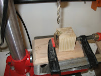 This is a jig I made from two pieces of hard wood, a 2" x 2" x 2" ash with a 90 degree slot cut as indicated, and a piece of 3/4 in x 4" x 6" as the base, then screwed together as shown. This is to hold the blank in an upright position for drilling and also trimming with a milling tool. I also drilled a 1/2 inch hole in the base (as shown) to allow for the drill bit to pass throw while drilling the blank.